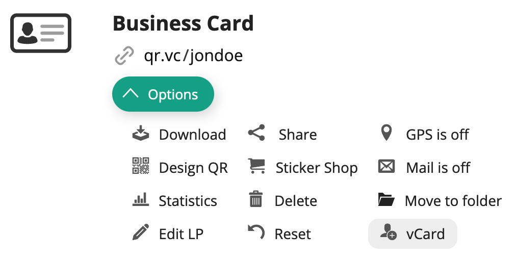Enable Add to contacts for download contact to address bookAnother approach is to copy the vCard Link from the Options menu of the business card and paste the link in the URL field of a call-2-action button.
